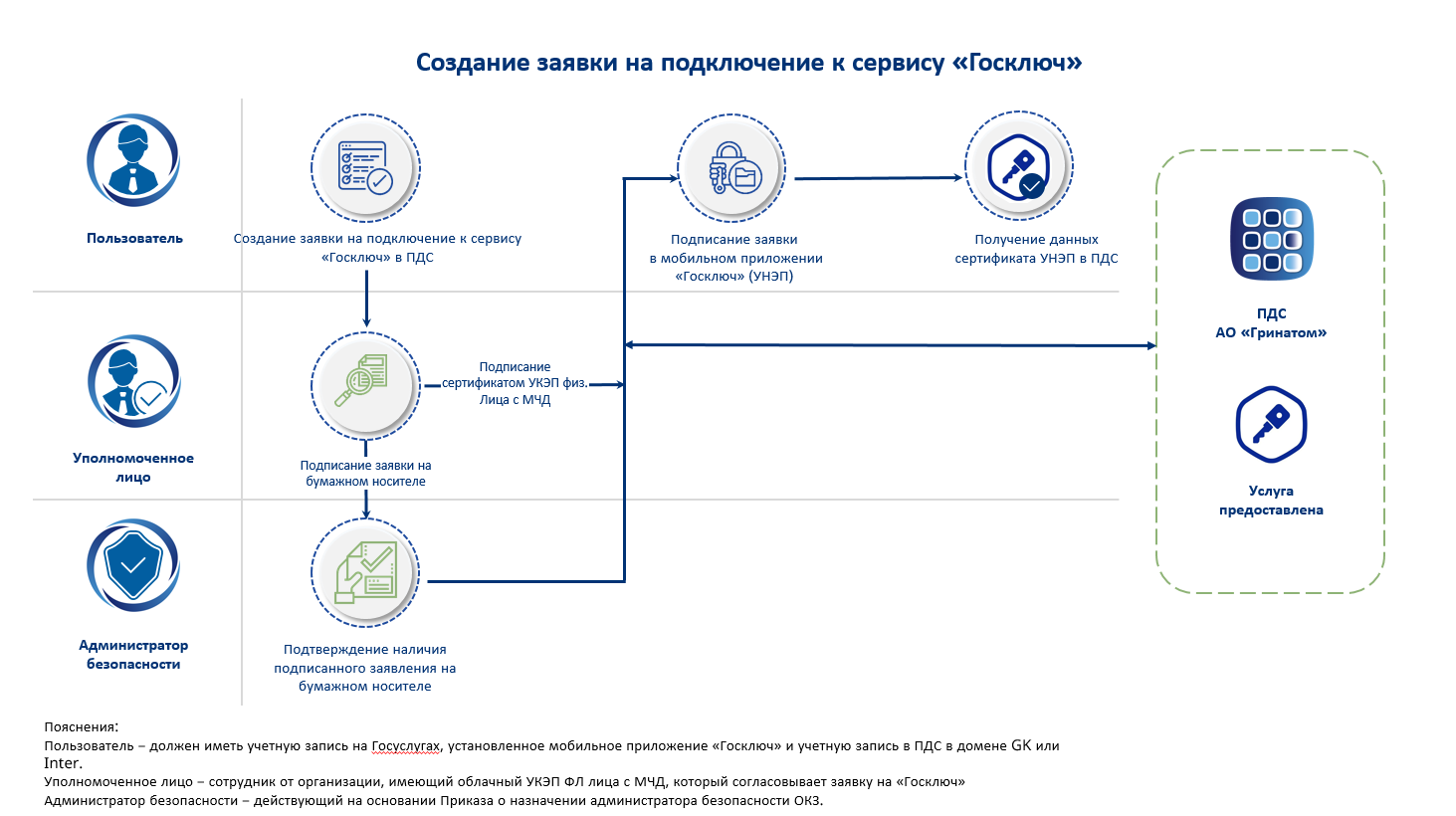 - управление заявками на подключение к Сервису «Госключ» с возможностью создания, просмотра, редактирования заявки и подписания заявки;