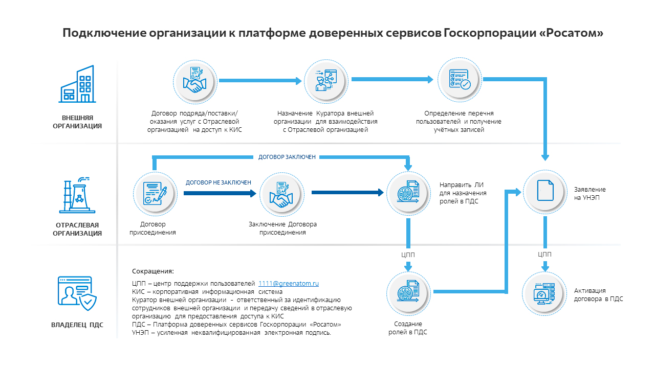 Внешние организации запрашивают доступ к КИС для исполнения своих обязательств по договорам с отраслевыми организациями. Для того, чтобы применять УНЭП Внешняя организация назначает ответственного сотрудника (куратора), который идентифицирует пользователей и направляет перечень пользователей в отраслевую организацию в рамках стандартного процесса получения учётных записей в домены INTER/GK Отраслевая организация в рамках договора присоединения направляет Листы исполнения для доступа к ПДС, а так же направляет заявление на предоставление услуги платформы доверенных сервисов Госкорпорации «Росатом» в отношении усиленных неквалифицированных сертификатов электронной подписи.