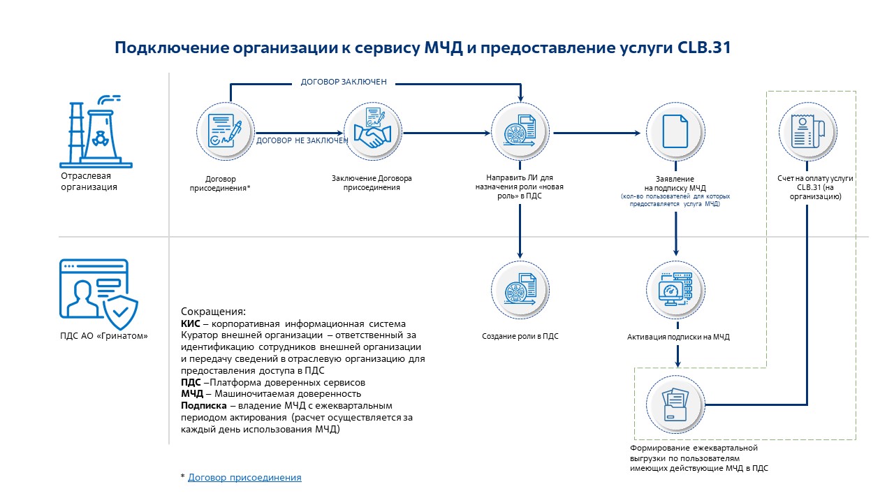 Для реализации требований законодательства, отделом криптографической защиты информации и цифрового доверия АО «Гринатом» разработана новая услуга (CLB.31) в Платформе доверенных сервисов (далее – ПДС) – «Сервис предоставления машиночитаемых доверенностей», необходимая для процессов в информационных системах электронного документооборота, где происходит подписание электронных документов сертификатом усиленной квалифицированной электронной подписи (УКЭП) физического лица, действующего на основании доверенности от юридического лица.